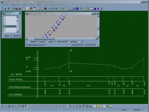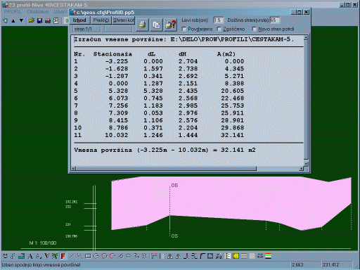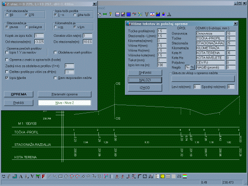 Na podlagi aktivnih linij v risbi se kreira oprema načrta, katere parametri so poljubni in jih uporabnik sam izbere. Linije se na začetku generirajo iz izbranih povezav, vendar jih lahko uporabnik editira (briše, riše, ...). V primeru več profilov se lahko oprema tvori tudi za vse profile naenkrat. Enak princip je tudi pri izrisu - ali aktiven ali pa vsi profili. Profil ima lahko poljubno število podvišin Ho, katere se v opremi izpisujejo vsaka v svoji vrstici. |