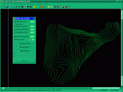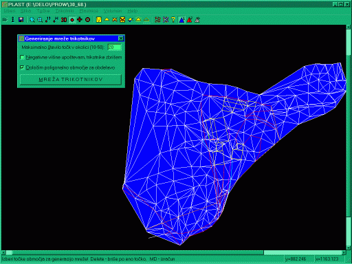 Modul je popolnoma integriran v program GEOS, tako da se realno prikazujejo in obdelujejo vsi elementi slike. Na podlagi baze točk, se zgenerira mreža trikotnikov, ki so potem osnova za interpolacijo plastnic. Pri izbiri točk za trikotnike obstaja možnost obdelave tudi po območjih. Trikotniki se lahko naknadno ročno popravljajo, brišejo in dodajajo. Mreža trikotnikov se lahko tudi shrani v svojo datoteko, katero lahko pozneje kadarkoli aktiviramo. | ![]() |
