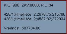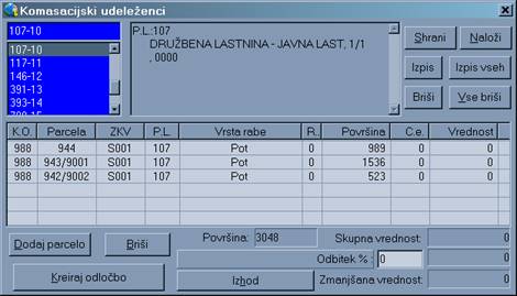 Na desni strani dialoga imamo polja za vnos podatkov parcele za izbranega udeleženca / poligona, katere potrdimo z ukazom 'Potrditev'. Ukaz 'Vložek' nam za izbranega udeleženca prikaže vložek parcel / vrednosti (če smo jih seveda predhodno izbrali).