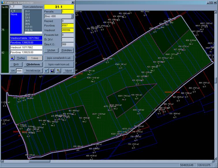 V tem dialogu obdelujemo table. Na levi strani so grafično predstavljene vrednosti cenilnih enot in lista, kjer so table. Za novo tablo označimo 'Nova' ter nato 'Obdelava'. Preidemo v sliko, kjer izberemo nivoje, v katerem so merodajne povezave za poligon, ki predstavlja obod table. Z levim gumbom (ML) se nato poligon izbere in če je najden, se za trenutek tudi obarva. Dokler z desnim gumbom miške (MD) ne potrdimo, se najdeni poligon ne upošteva. Po pritisku na MD, program preračuna in tudi grafično prikaže vse vrednostne poligone znotraj table. Nato sledi izbor dveh točk, ki predstavljata osnovno smer za delitev. Če smo predhodno že izbrali smer, jo lahko ponovno pokličemo s tipko P. Po izbrani smeri moramo z ML izbrati začetno stran za iteracijo. Če je smer manjša od 45°, bo iteracija potekala vertikalno (stran: zgoraj ali spodaj), drugače pa horizontalno ( stran: levo ali desno). Na koncu še sledi vnos izbrane iskane vrednosti ter kateremu komasacijskemu udeležencu pripada ta vrednost.